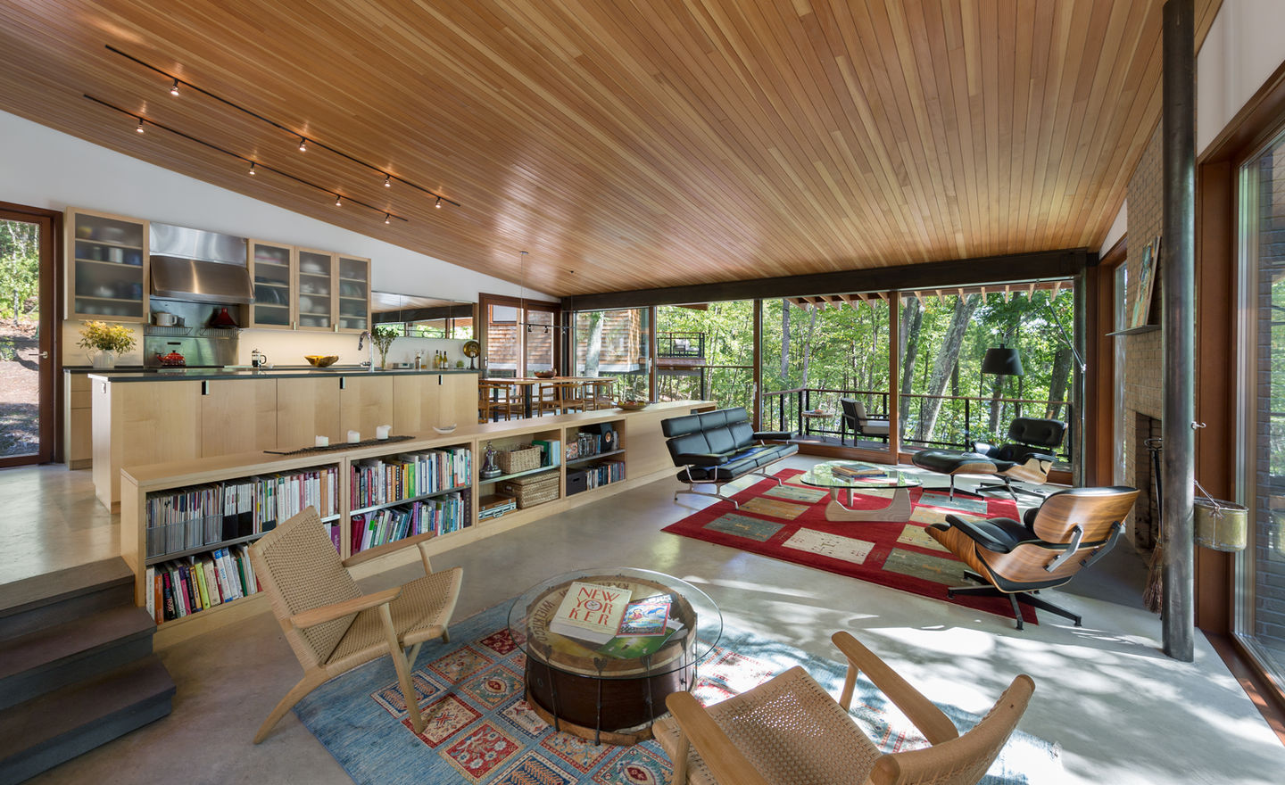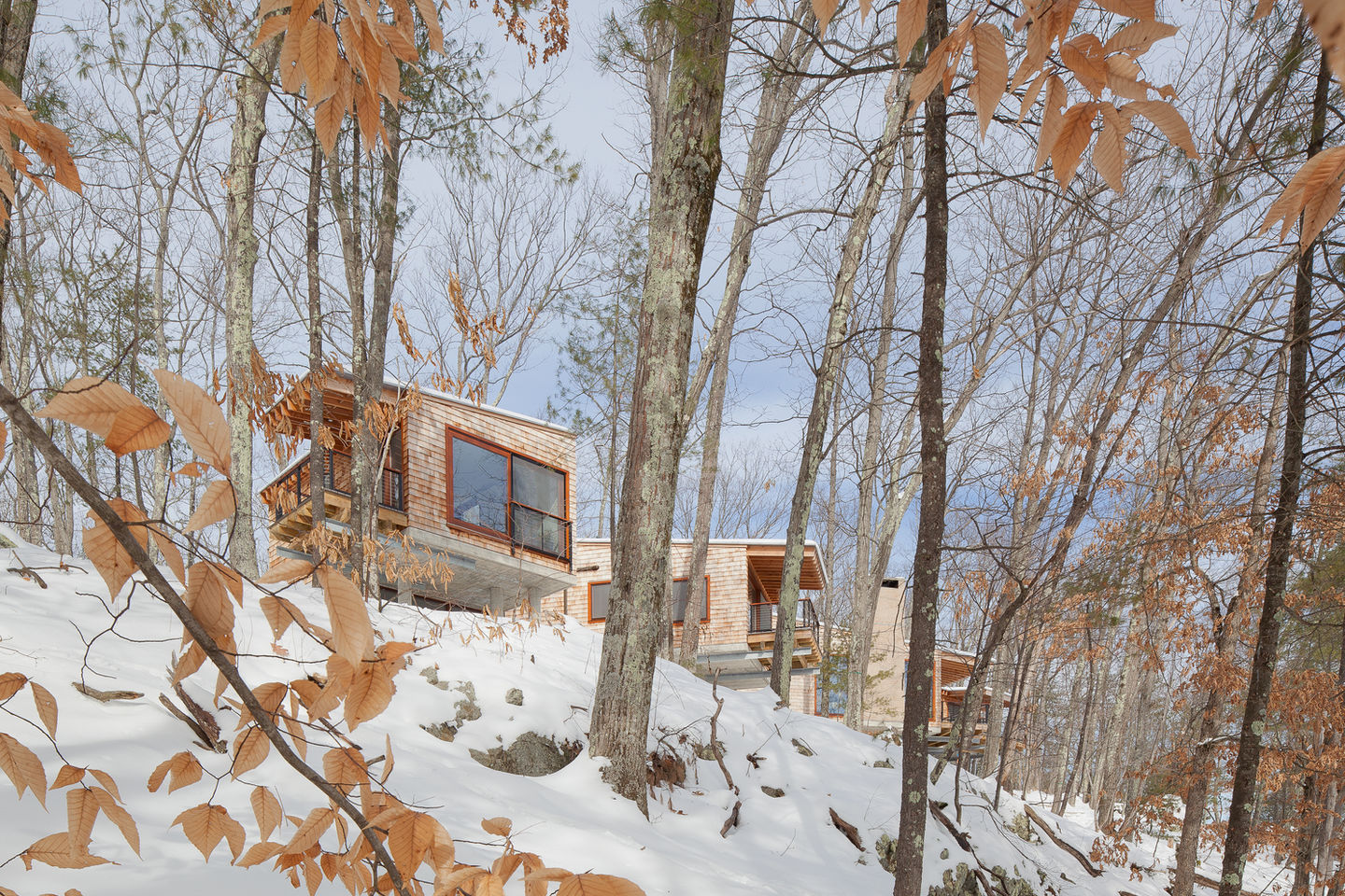 The Bare Hill Residence is clad with cedar shingles that slowly fade to soft gray, harmonizing with the concrete and colors of the wintertime forest floor. The careful reduction of footprint and scale integrates the building seamlessly with the landscape, resulting in a home that invites breezes, light, views, and nature to interact with life inside.