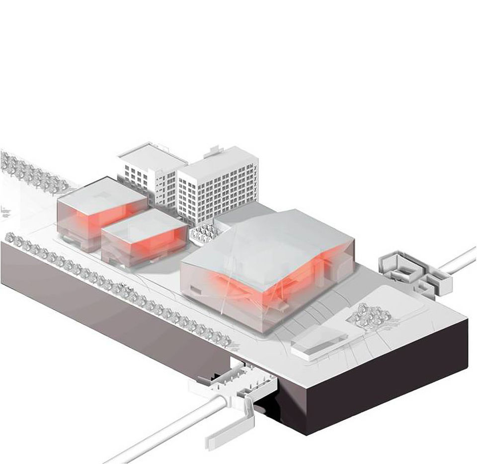 The resulting scheme is based on fundamental decisions about parking and loading, the concert hall dropoff, the public square and the tower placement and configuration. The natural "front" of the site on Jeanne Mance Street, facing the Museum of Contemporary Art, was retained for pedestrian traffic and creates an interior court serving as a space for concerts, films, and other public activity. Mayor Street, unessential as a traffic artery, would remain closed during public events and open during concerts for vehicular traffic. Extending the series of public spaces, a second entrance for the concert hall is located at the Places des Arts metro station.
