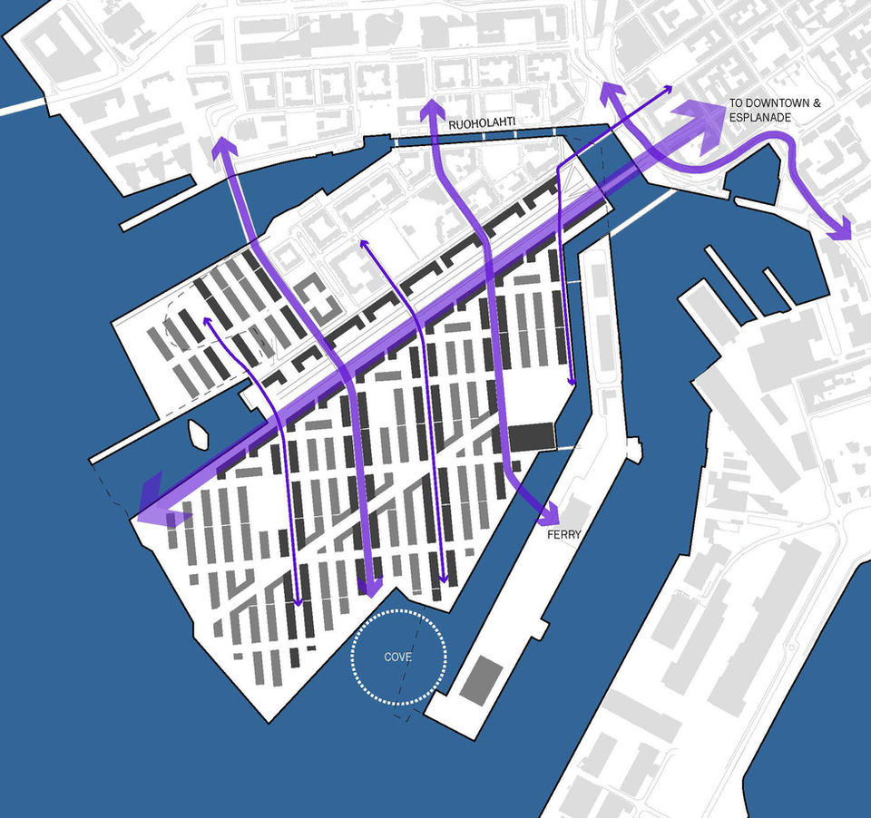 Our proposal is to redress, redirect, and reconnect Jätkäsaari to the northeast, into the heart of Helsinki. Two important, historic streets, Lonnrotink and Kalevankatu, can be axially extended through Jätkäsaari to provide an elegant means to this end.