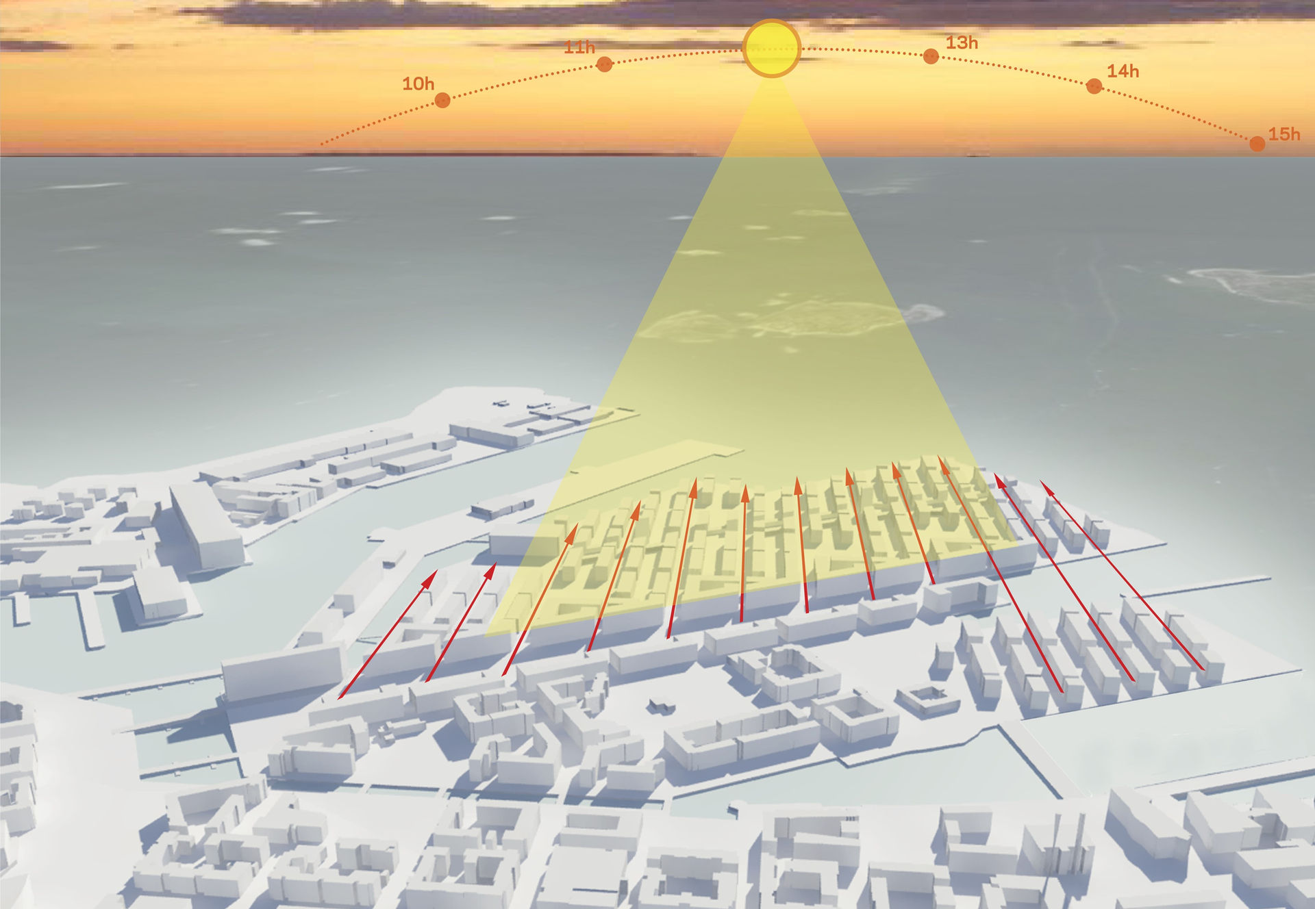 Extensive analysis of the movement and effect of the sun during winter months made it clear that orientation and configuration of streets and buildings play an enormous role on the quantity and quality of daylight available. Streets oriented north/south and long, narrow “bar buildings” — and not courtyard buildings — were optimal for this northern latitude. Maximizing the amount of daylight not only reduces energy use but also improves people’s sense of well-being.